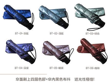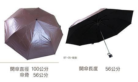 三折手開色膠晴雨傘收傘長度:26 公分開傘長度:56 公分 ( 傘頂到握把間距離 ) 重量:310 公克 開傘後直徑:100公分 傘骨:八支傘骨,鋁合金、中尾段─玻璃纖維傘骨傘骨長度:56 公分傘布:密度210T色膠布,共上四層色膠層防曬遮光效果佳功能:遮陽、擋雨、抗UV、防曬、防風