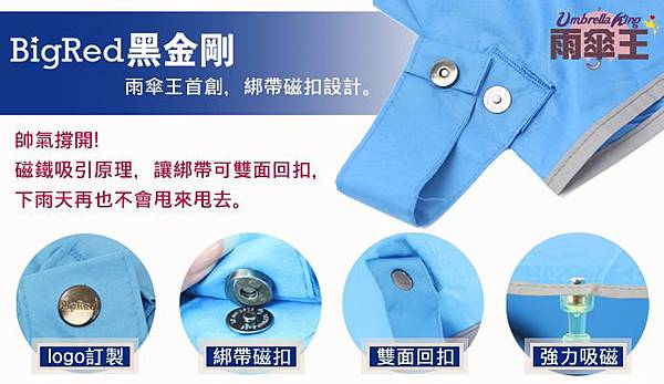 《BigRed黑金剛》自動傘,我們將魔鬼氈改良成磁扣設計,改善魔鬼氈長期使用的耗損問題,